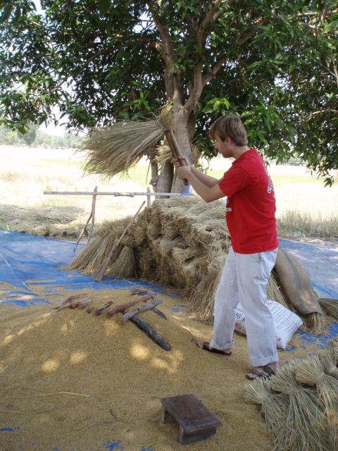 Tonight, on New Year's Eve, we were invited to come watch and understand more about a yearly ritual called "Baan Pa Bu Rut." At this ritual, more than 70 or so people came. There was a decorated altar with bananas and other foods created for the worship of ancestors. Around this were many people sitting, musical instruments playing, lots of laughter, and one particular person who acted like some sort of a medium. She would do a little motion with her hands for a minute or so, and then after that, they believe that one of their deceased ancestors has come, and is inside of the ladies body. After the person introduces himself/herself, family members come and talk with their deceased ancestor. They believe that these deceased ancestors have some kind of influence over their lives, so they want to make sure that their ancestors are appeased. This ceremony also includes traditional dancing and doesn't finish until morning on New Years.